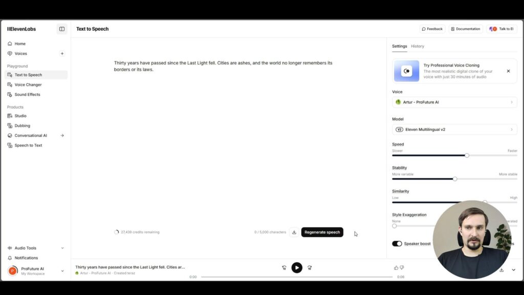 Nauczysz się generować naturalnie brzmiące dialogi i narracje oraz efekty dźwiękowe SFX za pomocą ElevenLabs. Przejdziemy od podstaw obsługi po zaawansowane techniki.